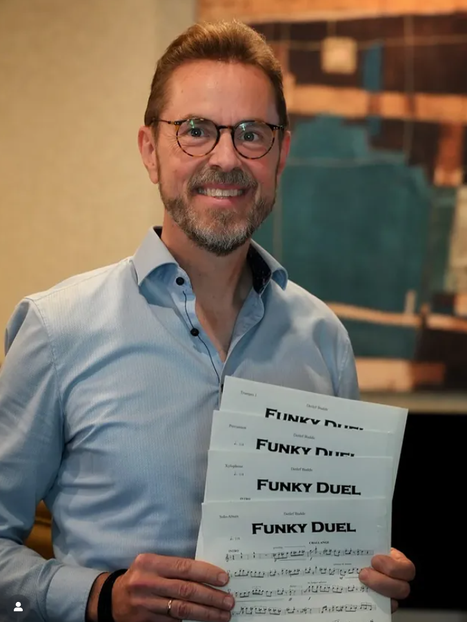 Das Interessante an Funk-Music ist beispielsweise, dass der Bass ein unruhiges Eigenleben führt. Das ist in der Rockmusik nicht der Fall. Das Schlagwerk vollzieht im Funk synkopische Offbeat-Rhythmen, die für Rockmusik ebenfalls untypisch sind. Ein weiteres wesentliches Merkmal von Funk ist die repetitive Grundrhythmik. Dabei kommen häufig percussiv gedachte Einwürfe der Bläser zum Einsatz. Auch relativ eigenständige Mallets sind im Funk häufig anzutreffen. Das eignet sich für "Funky-Duel" besonders gut. Damit war die Entscheidung, das Stück im Funk-Style auszuarbeiten, gefallen.