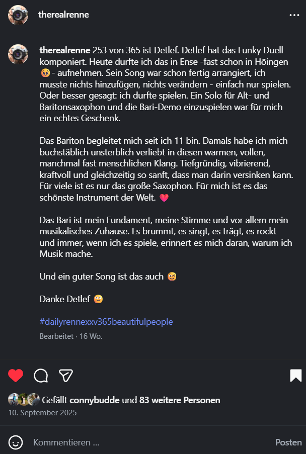 Lesenswert ist auf jeden Fall auch Renés Liebeserklärung an das Barisax. Ein Instrument, das über fantastische Möglichkeiten verfügt, aber häufig unterschätzt und leider oft schlecht gespielt wird.